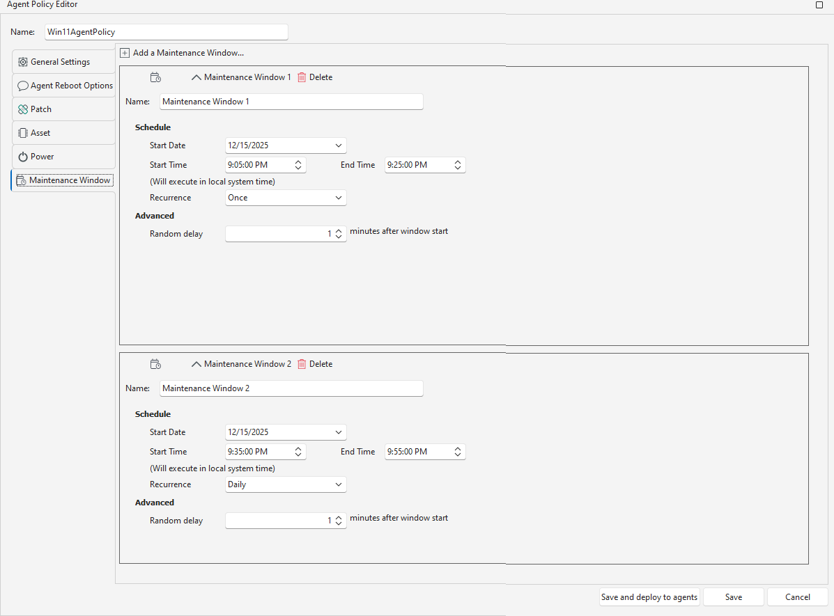 On the Agent policy Editor, click Maintenance Window tab and Add a Maintenance Window.