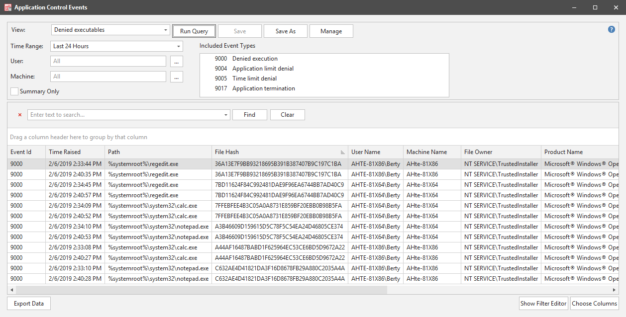 - Summary Only - only applicable for the Denied Executables and Allowed Executables Views. If selected, the results are grouped on file path and event id.