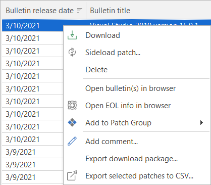 You can right-click on any patch or product level in the top pane of Patch View and perform a number of different actions.