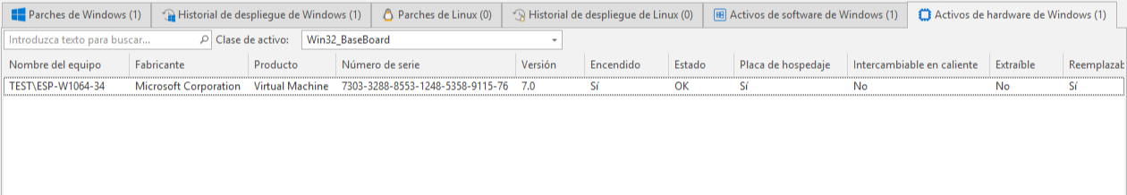 Muestra información del análisis de activos de hardware para los equipos de Windows seleccionados en el panel superior. La información que se muestra depende de la plataforma y del proveedor del producto. No todos los proveedores proporcionan toda la información, por lo que algunas columnas pueden estar en blanco. Se puede personalizar la forma en que la información aparece en este panel. Para obtener más información, consulte Personalización de los encabezados de columna.