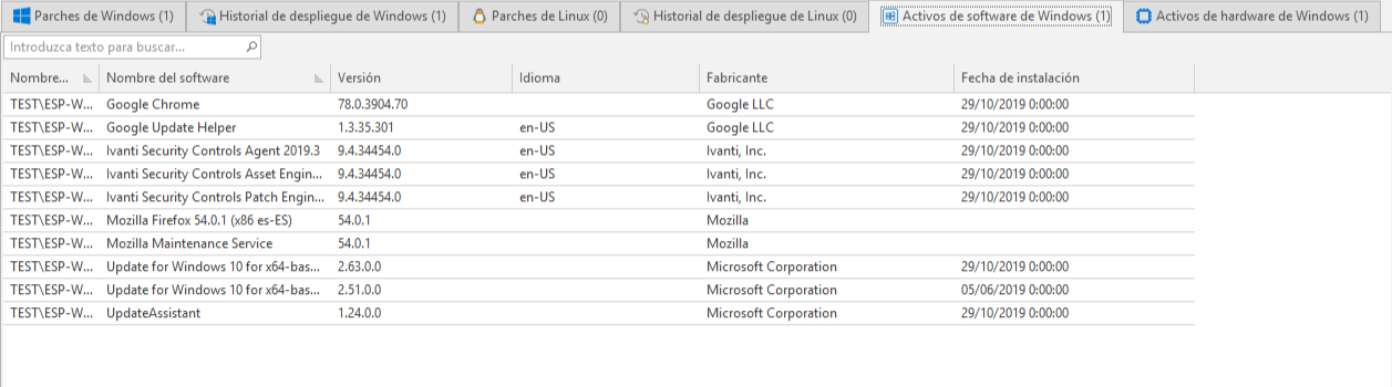 Muestra información del análisis de activos de software para los equipos de Windows seleccionados en el panel superior. Se puede personalizar la forma en que la información aparece en este panel. Para obtener más información, consulte Personalización de los encabezados de columna.