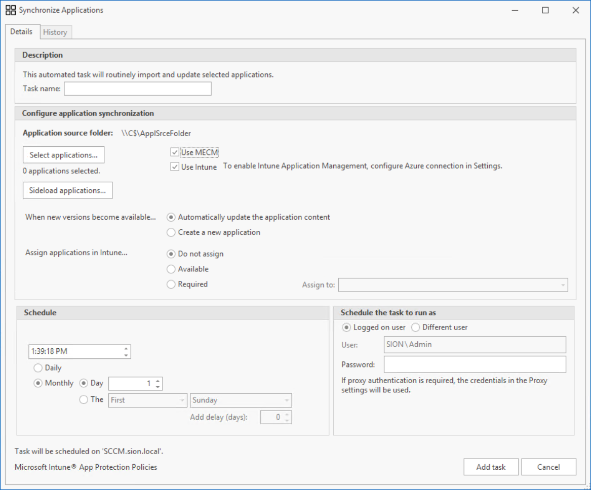 - Usuario que ha iniciado sesión: Si se habilita, especifica que utilizará las credenciales del usuario que haya iniciado sesión para agregar la tarea de adición a Microsoft Scheduler. El cuadro Usuario se rellena automáticamente, por lo que sólo necesita escribir la contraseña de la cuenta.