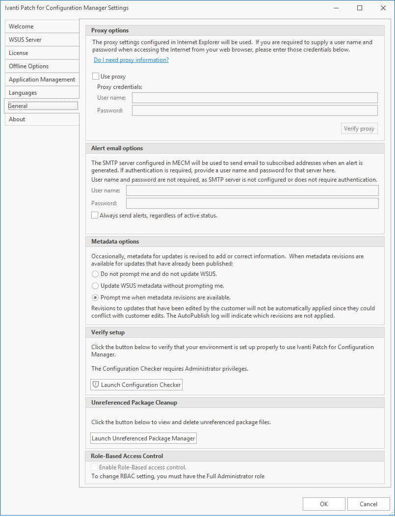 La pestaña General se usa para especificar sus opciones de proxy y de metadatos y para iniciar la utilidad de Verificador de configuración.