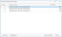 Aparece el diálogo Gestionar paquetes sin referencia, que muestra una lista de carpetas que no tienen referencia al servidor WSUS.