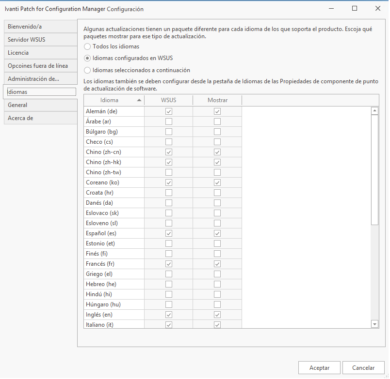 - Mostrar columna: Marque la casilla de cada idioma que desee visualizar en la vista Patch for Configuration Manager. Puede seleccionar un idioma aunque actualmente no esté configurado en WSUS.