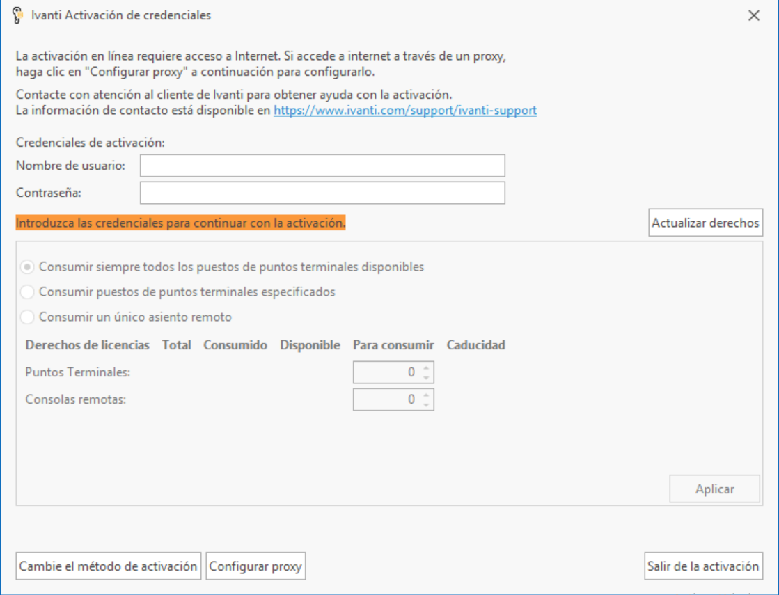 • Método de activación de credenciales Este método de activación se debe usar si es un nuevo cliente y tiene una conexión de internet de la consola. Si no tiene conexión a internet, utilice el Método de activación de claves de licencia.