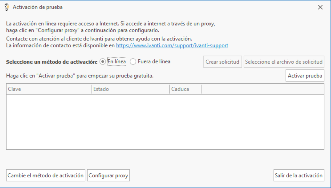 • Método de activación de prueba Este es el método de activación que se debe usar si va a usar el programa en modo de prueba. Le permite probar todas las capacidades de Patch for Configuration Manager, pero hay limitaciones. La licencia solo tiene validez durante 60 días, tiene un límite de 50 puestos de licencia y solo puede publicar cinco actualizaciones distintas. Cuando caduca una licencia de prueba, el programa dejará de actualizar sus archivos de datos y muchas funciones del programa ya no estarán disponibles.