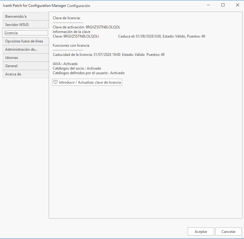 • Método de activación de claves de licencia Este es el método de activación legado. Se debe usar si empezó a usar Patch for Configuration Manager anterior a la versión 2020.1 y necesita actualizar su licencia tras una actualización. También lo usa toda persona que no tenga una conexión de internet de la consola.