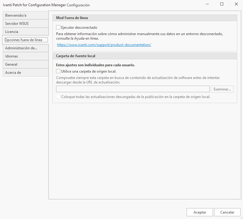 Esta área proporciona la opción de ejecutar Patch for Configuration Manager en modo fuera de línea. Para ajustar el modo fuera de línea, marque la casilla Ejecutar desconectado.