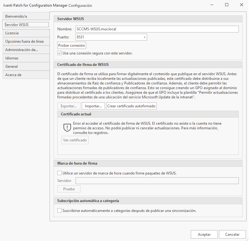 - Probar conexión: Si desea probar el acceso al servidor WSUS, haga clic en Probar conexión.