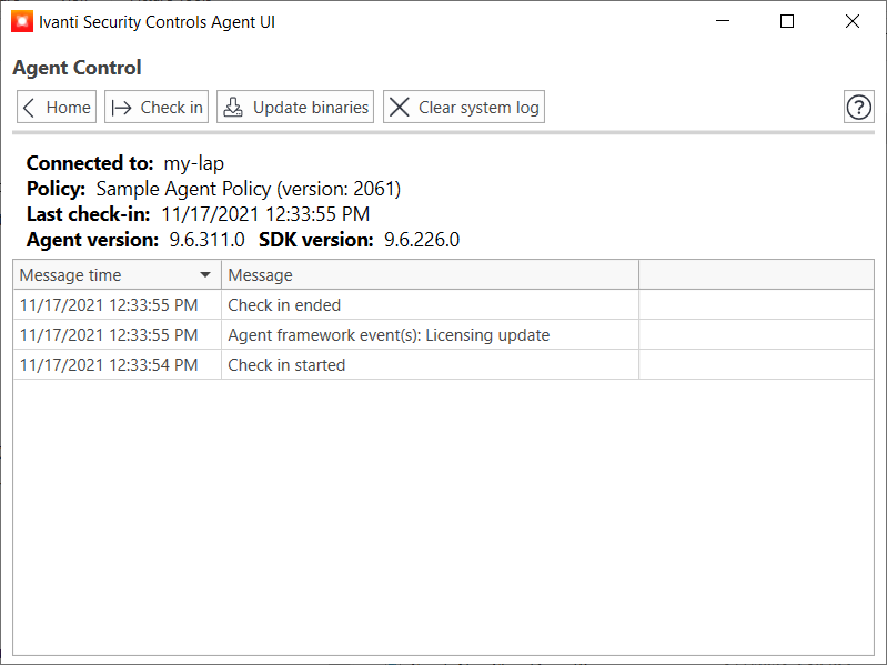 - Регистрация: Указывает агенту зарегистрироваться в Security Controls и загрузить любые изменения политики. Конечному пользователю обычно не потребуется использовать эту кнопку, если это не будет явно указано администратором.