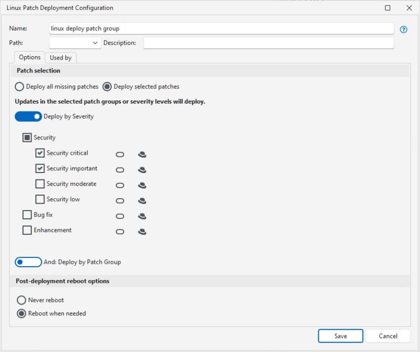 Конфигурация развертывания исправлений Linux определяет, как будет выполняться развертывание исправлений. Существуют отдельные конфигурации развертывания исправлений для нового метода исправления Linux без использования особых данных и предыдущего метода исправления на основе данных. Новый метод без использования особых данных выполняет сканирование всех отсутствующих исправлений как часть всех конфигураций развертывания исправлений.