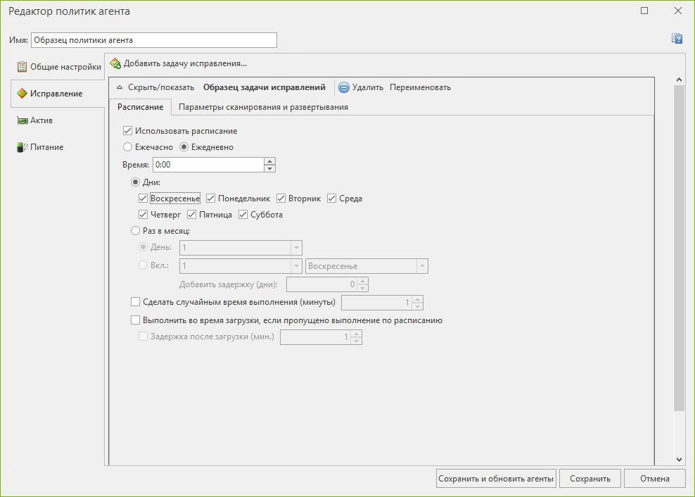 Задача исправления позволяет определить, как и когда будет выполняться сканирование целевых компьютеров для обнаружения отсутствующих исправлений. С ее помощью можно также при желании развертывать недостающие исправления. Если задача исправления не создана, агенты, которым назначена эта политика, не будут выполнять сканирование и развертывание исправлений.