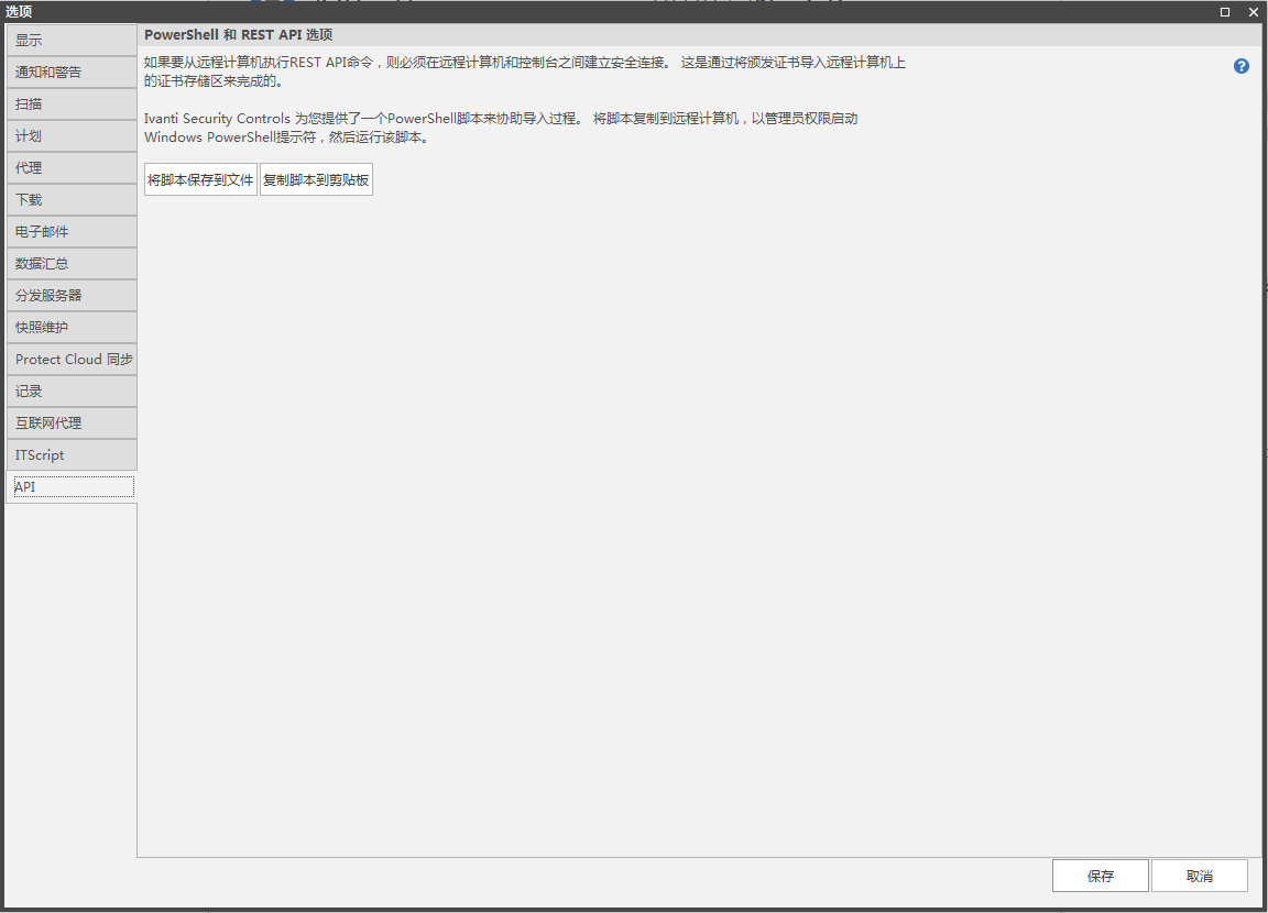 API 选项卡提供对 PowerShell 脚本的访问,该脚本将自动将 ST 发行证书从控制台计算机上的可信根颁发机构存储器导出到远程计算机上的当前用户可信根颁发机构证书存储器。 如果计算机上有多个用户,则只有执行 REST API 命令的用户才能运行该脚本。
