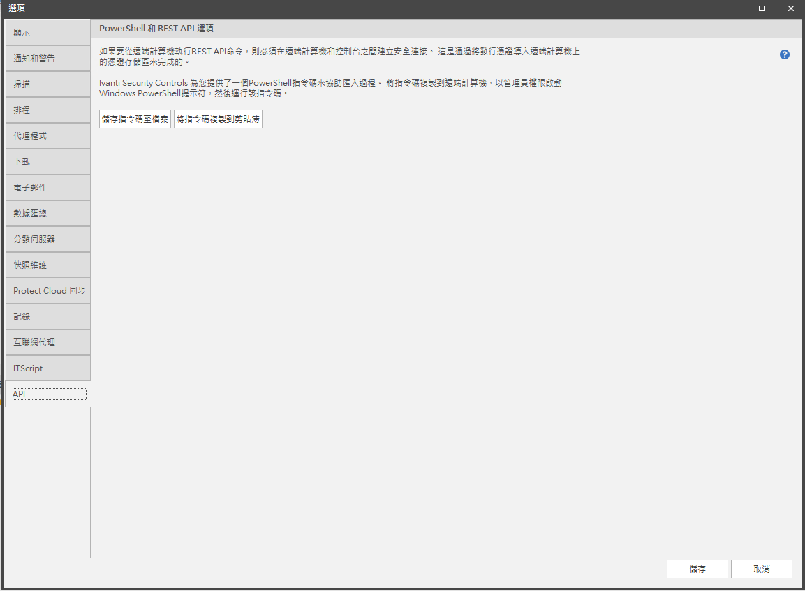API 索引標籤可提供 PowerShell 指令碼的存取權限,它會自動將 ST 發行憑證從控制台電腦上的「受信任根授權」存放區匯出至遠端電腦上目前使用者的「受信任根授權」憑證存放區。 若電腦上有多個使用者,則每個將執行 REST API 指令的使用者都必須執行指令碼。