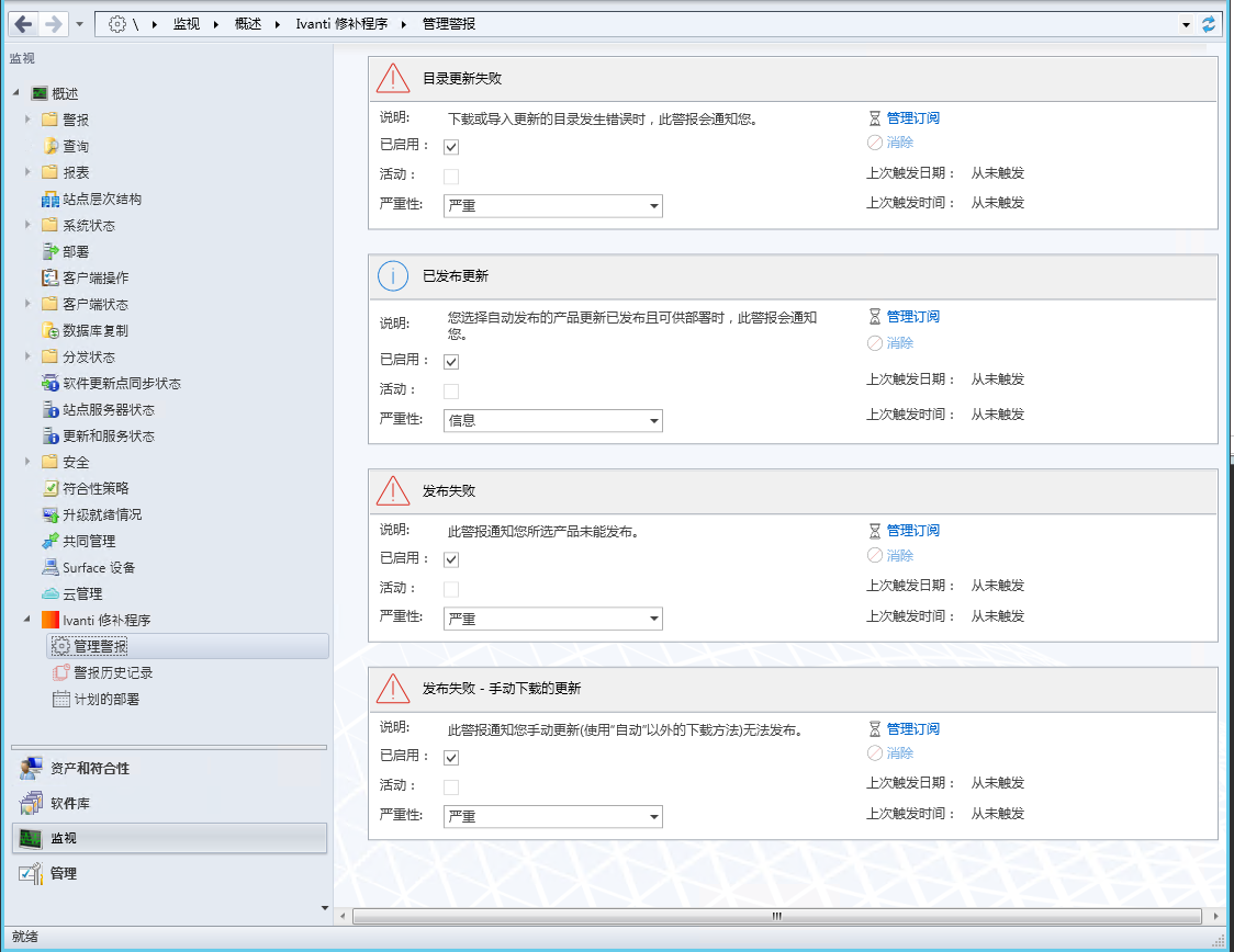 此区域用于查看和设置您的警报配置。 要访问此区域,请在配置管理器监控工作区内,展开 Ivanti Patch 文件夹,然后选择管理警报。