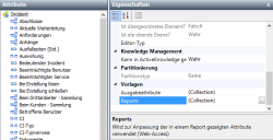 Um Abfrageergebnisse in Web Access oder Workspaces als Report anzuzeigen, müssen Sie eine Reportvorlage für das Objekt erstellt haben, auf dem die Abfrage basiert. - Klicken Sie oben im Baum Attribute auf den Objektnamen und klicken Sie dann im Bereich Eigenschaften neben Reports auf