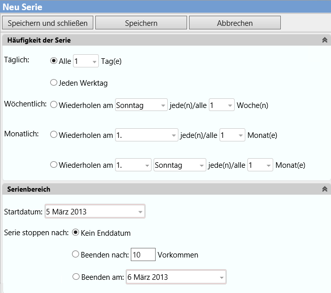 - Geben Sie in der Gruppe Häufigkeit der Serie an, wie oft der Termin wiederholt werden soll.
