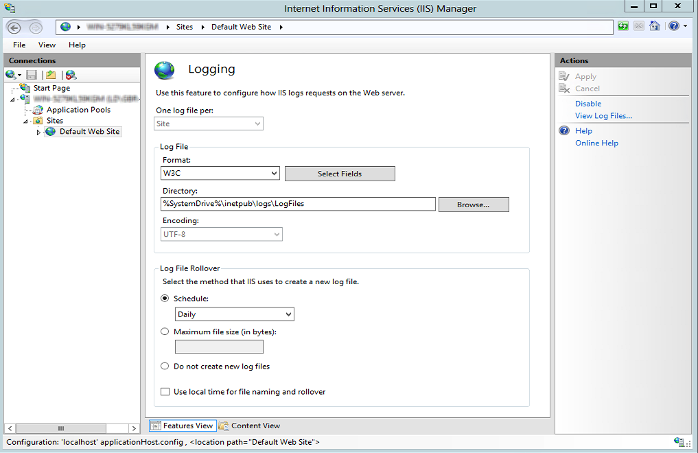 - Click the required Web site, then double-click Logging in the right hand Features View pane.