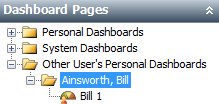 A folder for the user, containing their current dashboards, appears on the Dashboard Pages tree. You can now maintain this user's dashboards in the same way as any other dashboards.