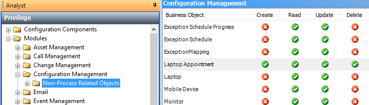 If you have the appropriate privileges, you can drag appointments that appear on a Calendar gadget to move them to a different time. You need to have the Create, Read, Update, and Delete privilege for the appropriate Appointment object under Non-Process Related Objects. For example, to move an appointment for a Laptop, you need these privileges set for Modules\Configuration Management\Non-Process Related Objects\Laptop Appointment.
