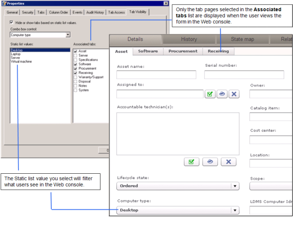For example, in the screenshot below, the "Desktop" static list value has the Asset, Software, Procurement, and Receiving tabs associated with it. Therefore, in the Web console, a user who selects the Desktop value under the Computer type combo box will be able to see only those four tabs in the form.