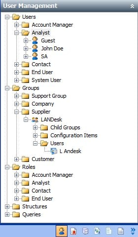 The User Management tree displays users, groups and roles. You can see related items by expanding the relevant user, group or role. From the tree, you can create, modify and delete all of these items, and link these items together.