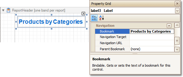 Click the Label in the Report Header band, to select it, and in the Property Grid, set its Bookmark property to the same value as its text (i.e. Products by Categories).