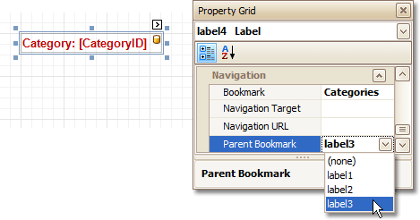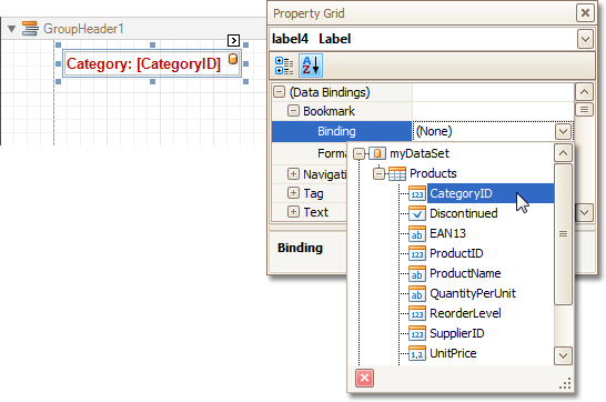 Now, select the Label in the report's Group Header band. As this control is bound to data, we w ill bind its Bookmark property to the same data field, using the (Data Bindings) property.
