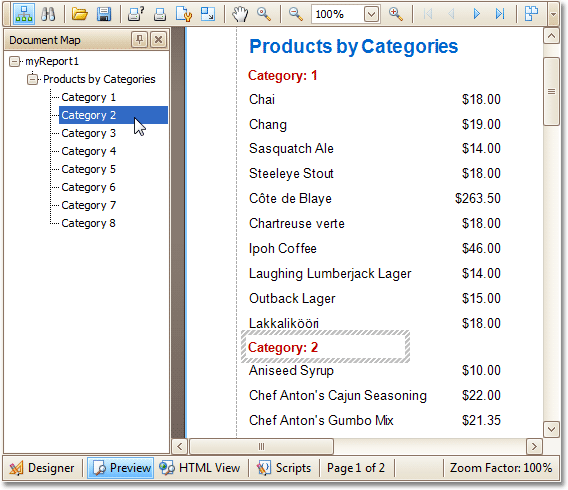 This tutorial describes the steps to create a report with bookmarks (also-called Document Map). This feature allows you to easily navigate through the report during print preview.