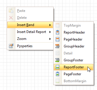 To display the result at the bottom of a report, the Report Header and Footer band should be present. To add it, right-click anywhere over the report's area. In the invoked Context Menu, select Insert Band | ReportFooter.