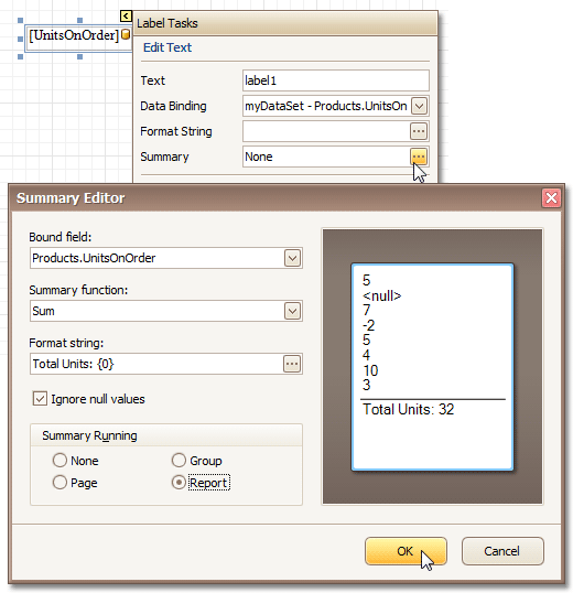 With Report Designer, you can force a data bound control to calculate one of the standard summary functions (Average, Summary, Count, Running Summary, Percentage, Max or Min).