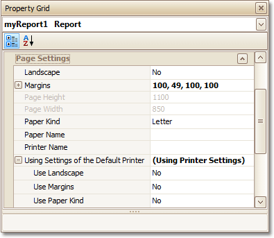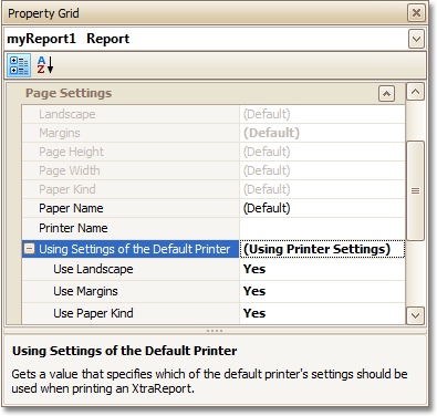 For the orientation, margins and paper size, you can specify a requirement that applies the corresponding printer settings instead of the reports. In this instance, the page properties in the Property Grid are disabled and displayed as greyed out. This may be useful when the report is printed in several places with different printers and printer settings.