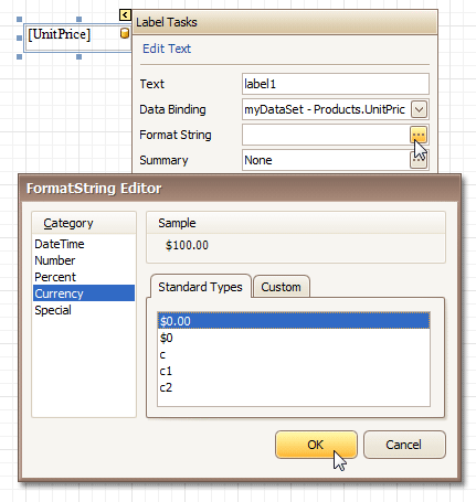 To apply value formatting for a data bound control's content (e.g. for it to be treated as currency, or date-time content), locate this control, click its Smart Tag, and in the invoked actions list, click the ellipsis button for the Format String entry.
