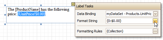 Similarly, when the Use Mail Merge in Report Elements is employed for a control's dynamic content, to apply a value formatting to an embedded data field, select it in the in-place editor, and click the control's smart tag. Then, in the invoked actions list, specify the required format.