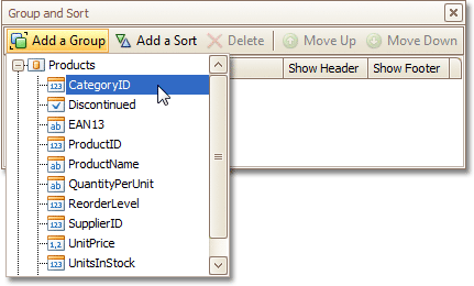 Now, switch to the Group and Sort Panels, and click Add a Group. In the invoked list, choose a data member across which the report is to be grouped. Note that grouping across calculated fields is supported, as well.