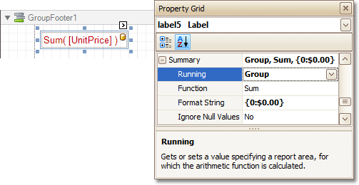 Then, you can calculate a total across the group, by placing a Label onto this band, and specifying its Summary properties in the following way.