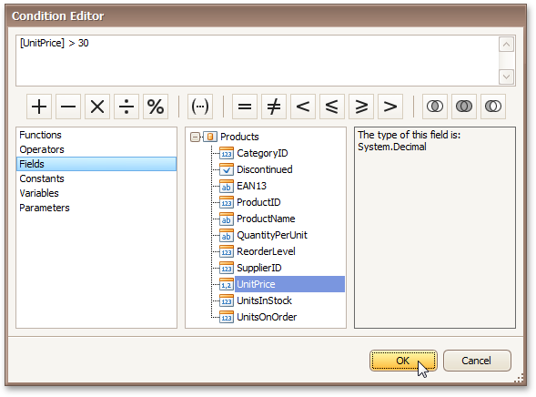 Then, in the invoked Condition Editor, define the required Boolean condition (which means that its result is returned as either true or false). In this tutorial, we will format fields if the UnitPrice value is greater than 30.