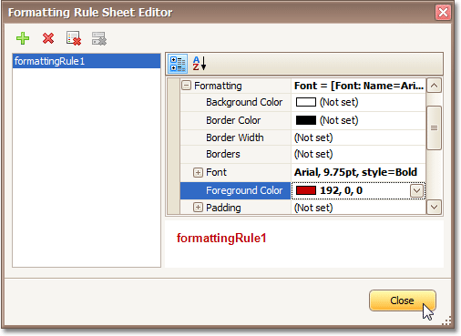 Now, back in the Formatting Rule Sheet Editor, define the formatting to be applied (e.g. specify the desired font color).