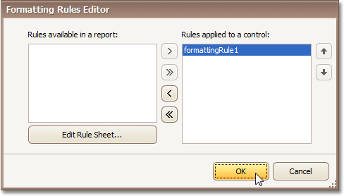 And, in the invoked Formatting Rules Editor, move the rule from left to right (using the > button), for it to come into effect for this band.
