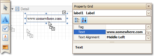 Drop a Label onto the report, and in the Property Grid, change its Text to the one required for the link.
