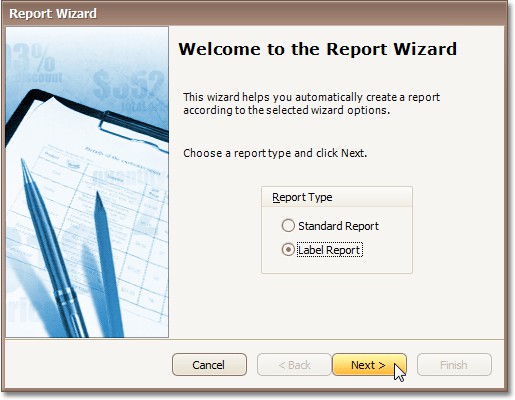The Report Wizard allows you to create reports of two kinds - Standard Report Wizard and label reports. To create a label report, invoke the Report Wizard dialog and choose the Label Report option on the Welcome page.