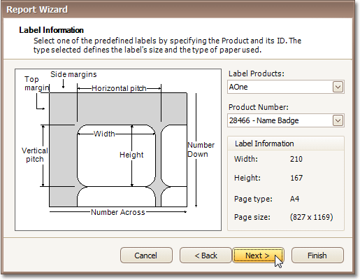 On this page, choose the supplier from the Label Products combo box and a particular product from the Product Number list. The box on the left-hand side will be updated to show you label dimensions for the currently selected product.