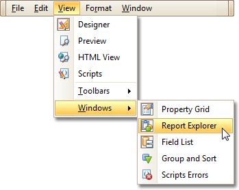 The Main Menu contains various commands grouped in four sub-menus. These menu items duplicate various commands available in the Report Designer's Toolbars, and allow you to switch between different Tabs, and hide or show the available Toolbars and Panels.