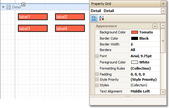 In the Report Designer, a report and each of its elements (bands and controls) has a complete set of appearance options (such as Background Color, Borders, Font, Foreground Color, Text Alignment, etc.). By default, these properties aren't specified, meaning that their real values are obtained from a control's (or band's) parent, which is the report itself. So, the appearance, specified for a report, is distributed to all its child elements. Similarly, the appearance of a band is translated to the controls it contains.