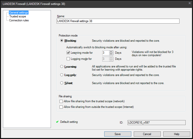 Use this dialog to create and edit Ivanti Firewall settings. When creating Firewall settings, you first define the general protection mode, and then add and configure specific trusted file lists, trusted scopes, and connection rules. You can create as many settings as you like and edit them at any time.