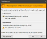 This dialog box refers to the IIS certificate on the core server bound to port 443. Clicking Yes imports the certificate into your local certificate storage. You won't see this dialog box again unless the certificate changes on the core server. If you don't click Yes, you won't be able to log in.
