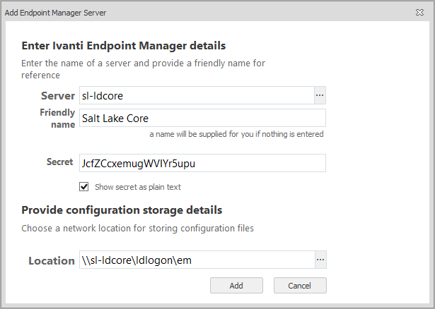 In the Add Endpoint Manager Server dialog box, enter your core Server name, a Friendly name that helps you identify your server in the server list, and the Secret string you found earlier.