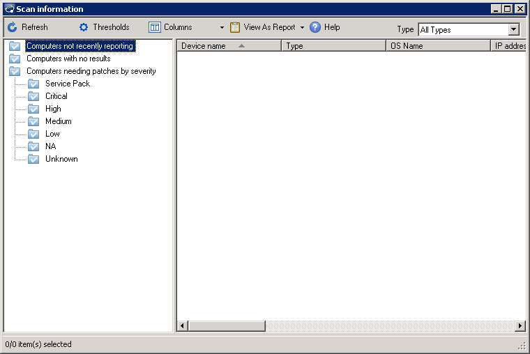 In the Patch and Compliance tool window, click the Scan information toolbar button to view detailed patch deployment activity and status for scanned devices on your network. You can view scan results for devices not recently reporting, devices with no results, and devices needing patches by selected severity type.