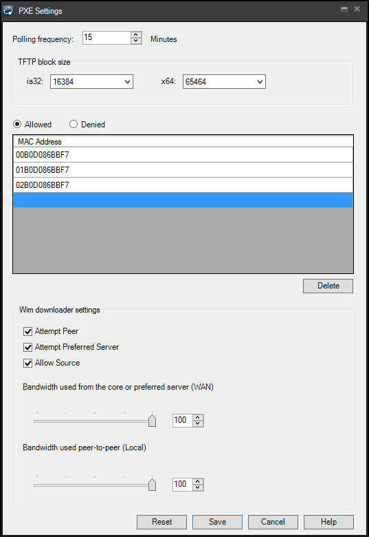 5. If you want to limit which devices can PXE boot you can add MAC addresses to the allowed or disallowed areas. By default this list is empty and PXE will boot all devices.